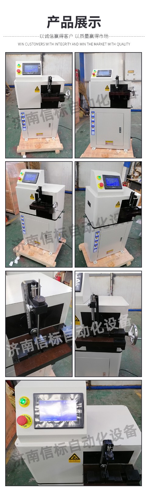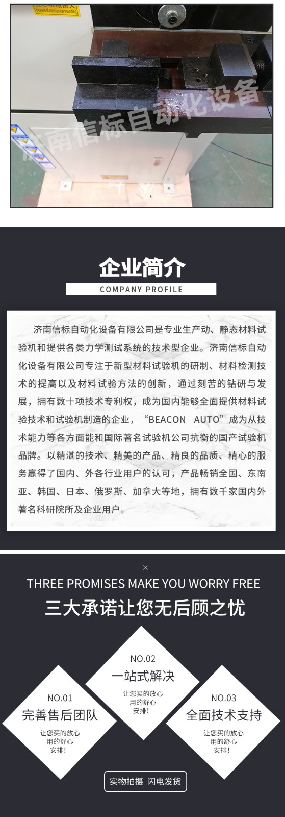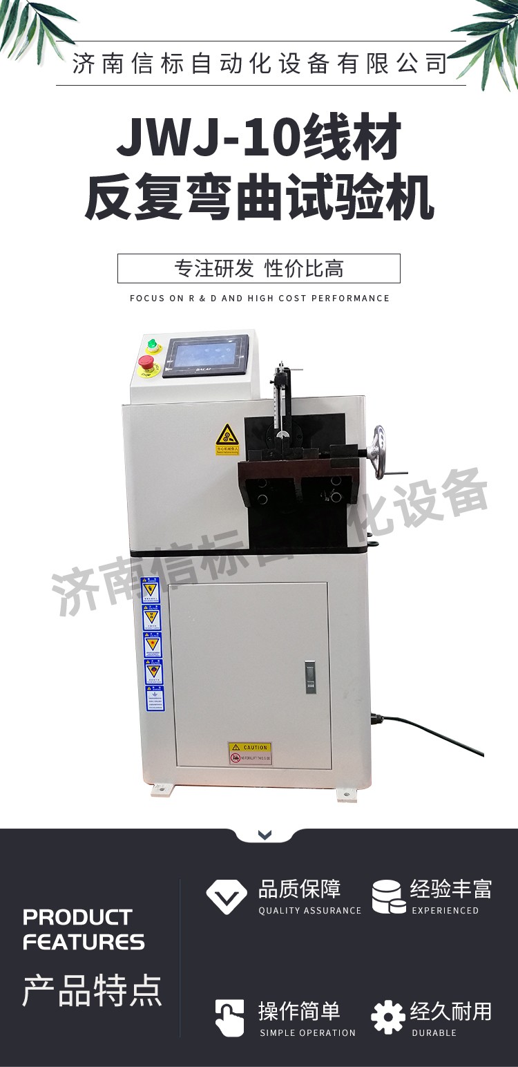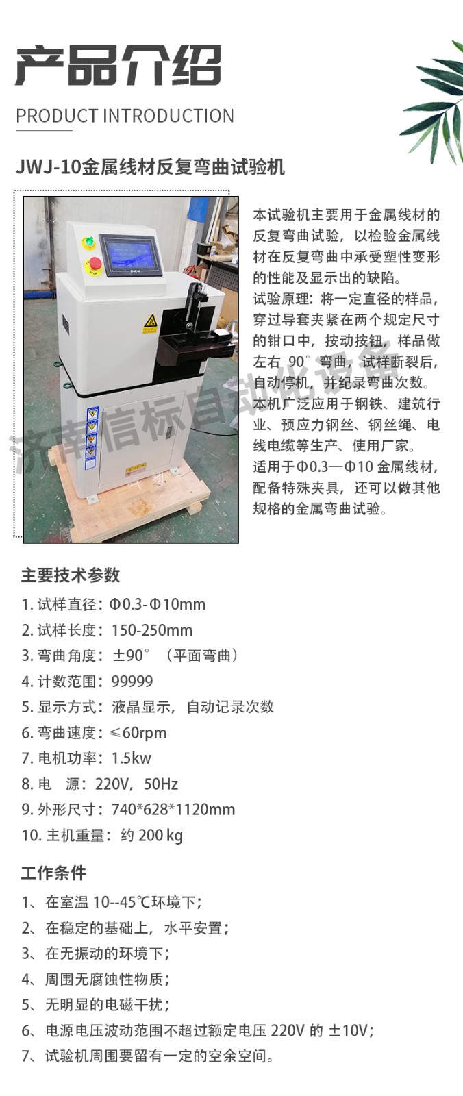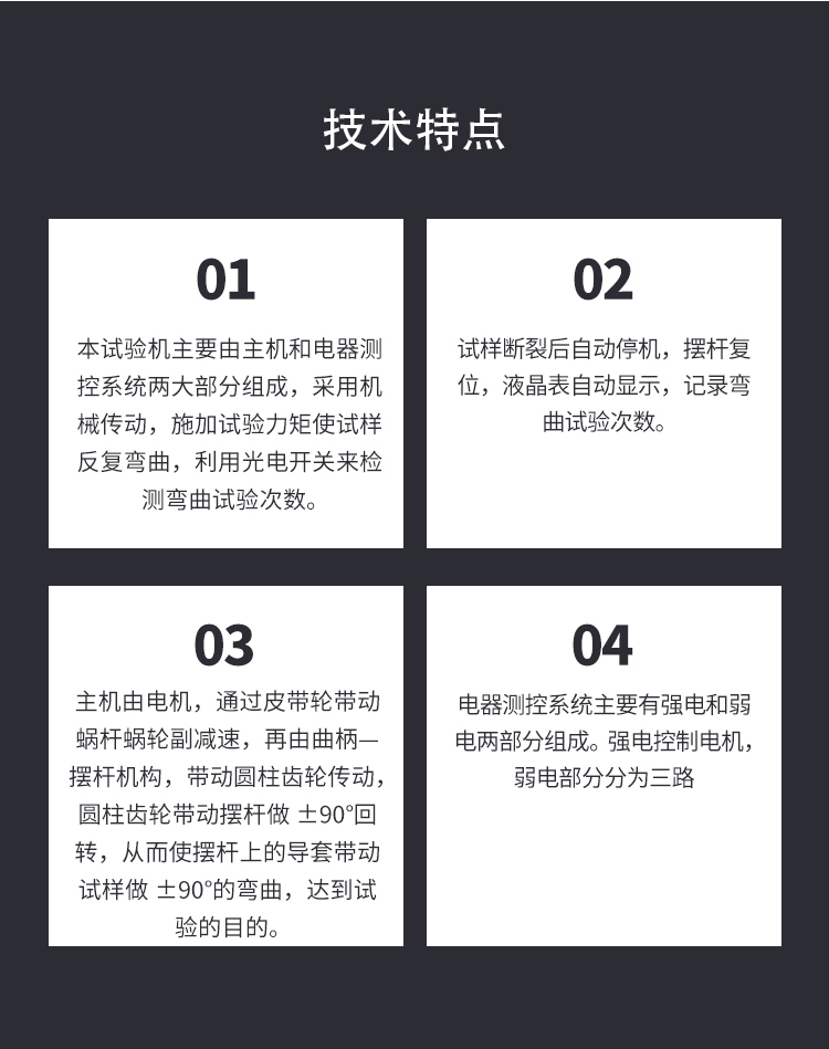 主要技術參數 1.試樣直徑:Φ0.3-Φ10mm 2.試樣長度:150-250mm 3.彎曲角度:±90°(平面彎曲) 4.計數范圍:99999 5.顯示方式:液晶顯示,自動記錄次數 6.彎曲速度:≤60rpm 7.電機功率:1.5kw 8.電 源:220V,50Hz 9.外形尺寸:740*628*1120mm 10.主機重量:約200 kg 結構特征與工作原理 本試驗機主要由主機和電器測控系統(tǒng)兩大部分組成,采用機械傳動,施加試驗力矩使試樣反復彎曲,利用光電開關來檢測彎曲試驗次數。試樣斷裂后自動停機,擺桿復位,液晶表自動顯示,記錄彎曲試驗次數。 主機 主機由電機,通過皮帶輪帶動蝸桿蝸輪副減速,再由曲柄—擺桿機構,帶動圓柱齒輪傳動,圓柱齒輪帶動擺桿做±90°回轉,從而使擺桿上的導套帶動試樣做±90°的彎曲,達到試驗的目的。在圓柱齒輪上裝有記數用的裝置,試樣每彎曲一次,光電開關采集一次信號,這樣就達到了記數的目的。 試驗結束后,如果擺桿沒有停到中間位置,按復位鍵,則由另一只光電開關采集信號,使擺桿恢復到中間位置。 在擺桿上,裝有撥桿,而撥桿上裝有內徑大小不同的導套,針對不同粗細的試樣,把撥桿調整到不同的高度,并使用不同的導套。將導套放入撥桿孔內,用扭簧將其別住,并使其與撥桿導通。 在擺桿的下方,裝有試樣夾持裝置。手動旋轉絲杠,使活動鉗口平移,將試樣夾緊。對不同直徑的試樣,更換相應的鉗口和導套(鉗口和導套上有標記)。