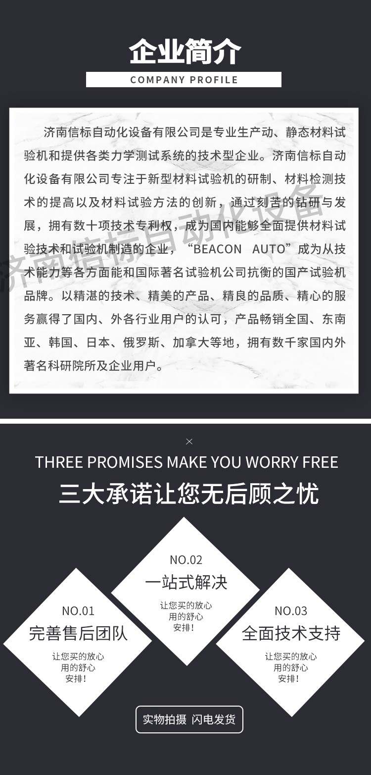 濟南信標自動化設備有限公司主要生產:動靜態萬能疲勞試驗機,接骨板彎曲試驗機,縫合線拉伸疲勞試驗機,髖膝關節磨損試驗機,電子萬能試驗機、液壓萬能試驗機、巖石三軸、四軸,電液拉力試驗機,材料試驗機,高低溫蠕變,高低頻疲勞,拉伸、扭轉、杯突等二十多個系列兩千多個的品種。